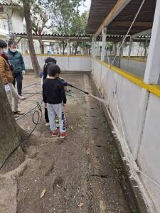 こどもたちが高圧洗浄機で渡り廊下の壁をきれいにしてくれました。